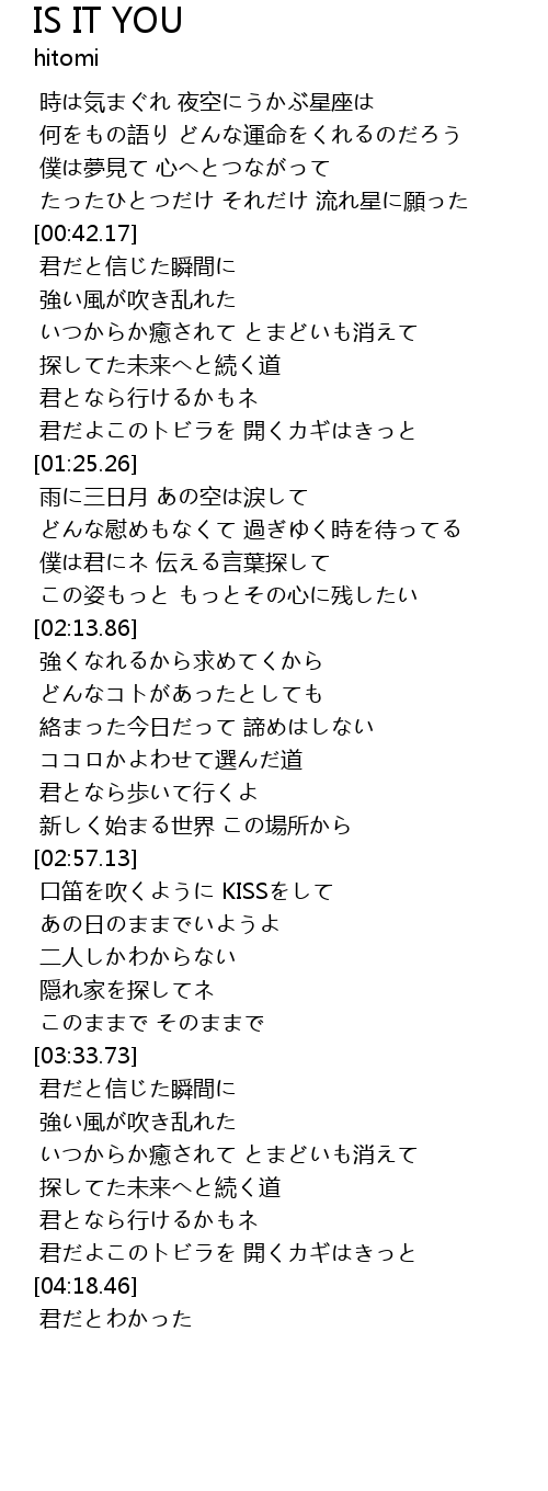 | [04:08.76] | 君だよこのトビラを 開くカギはきっと |