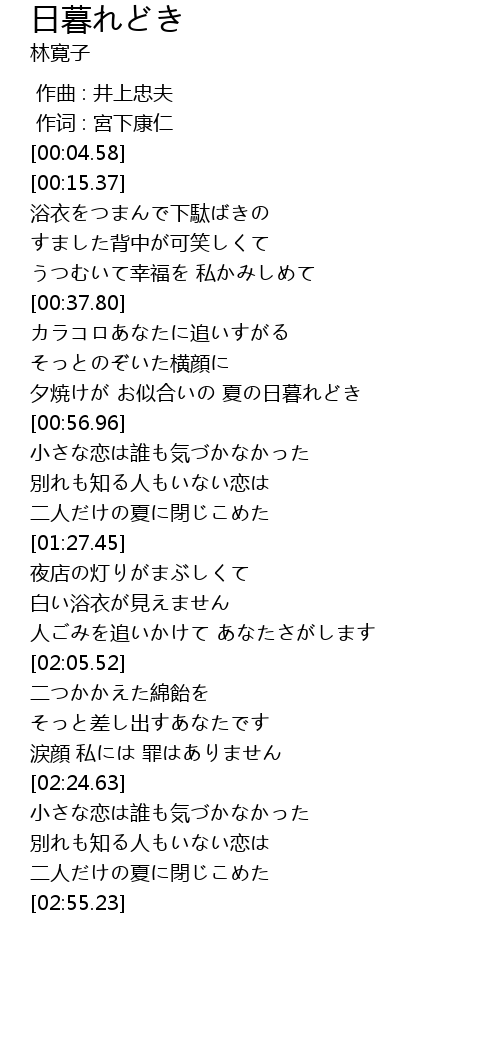 | [00:47.66] | 夕焼けが お似合いの 夏の日暮れどき |