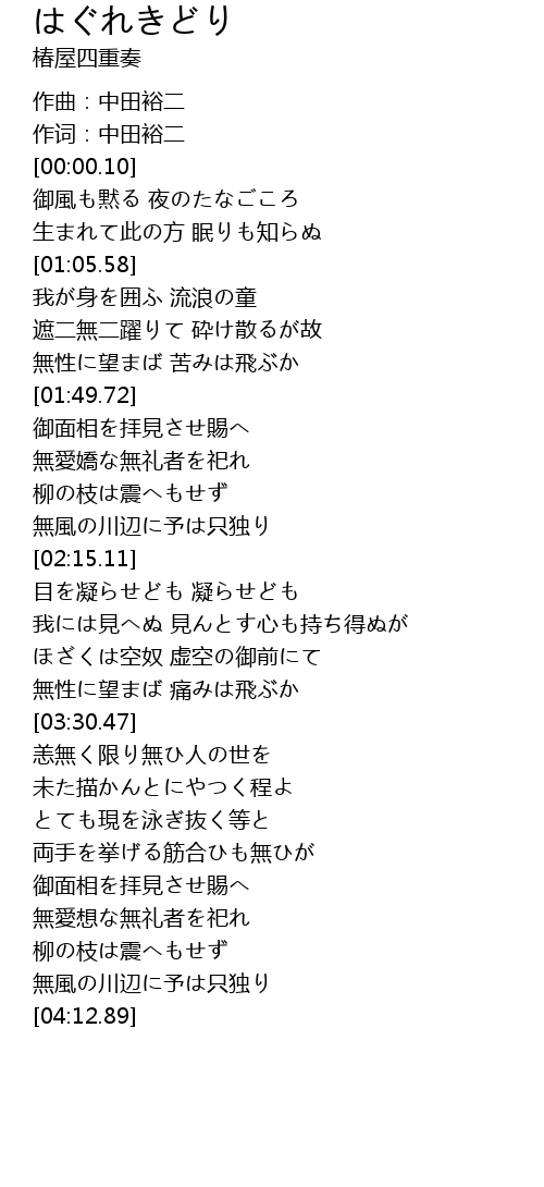 | [01:18.22] | 我が身を囲ふ 流浪の童 |