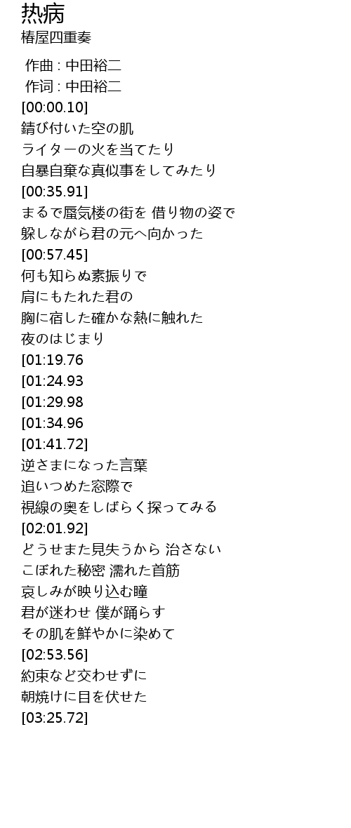 | [02:58.31][01:24.93] | 疑いを掠めたまなざし |