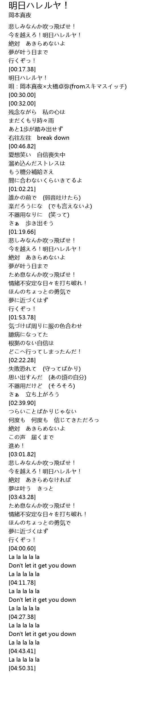 | [00:04.29] | 今を越えろ!明日ハレルヤ! |