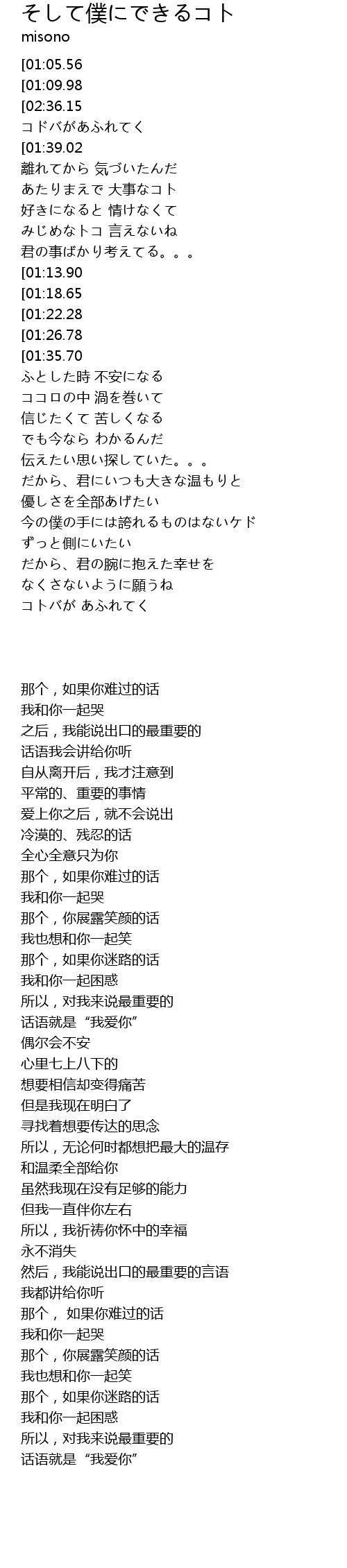 | [03:36.08][02:36.15][01:30.76][00:12.94] | そして、僕にできる何よりも大切な |