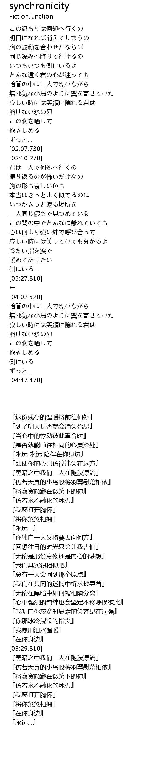 | [04:11.210] | 『仿若天真的小鸟般将羽翼慰藉相依』 |