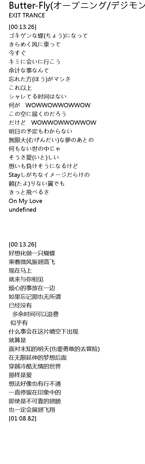 | 歌曲 | Butter-Fly(オープニング/デジモンアドベンチャー) |