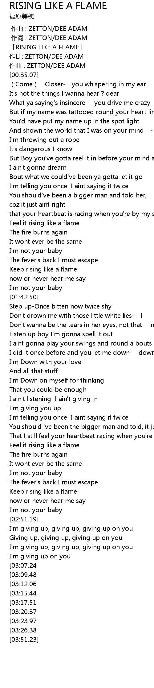 | [03:42.99][03:20.37] | Keep rising like a flame |