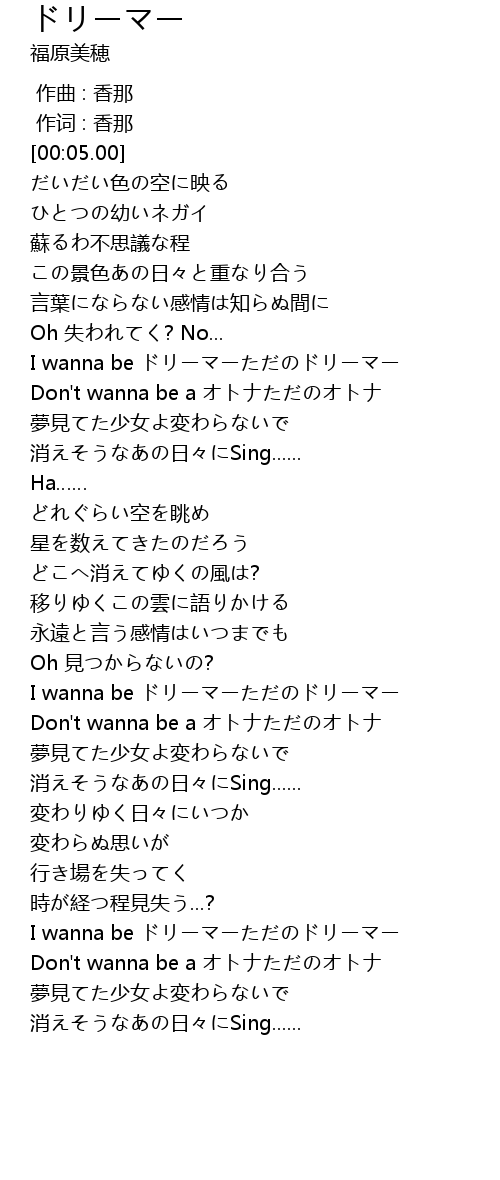 | [01:09.43] | I wanna be ドリーマーただのドリーマー |