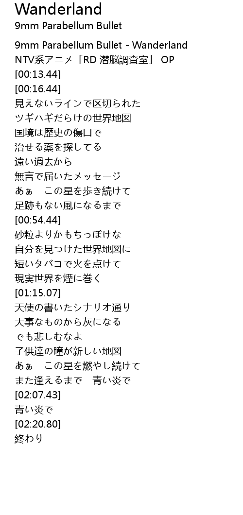 | [00:01.44] | 9mm Parabellum Bullet - Wanderland |