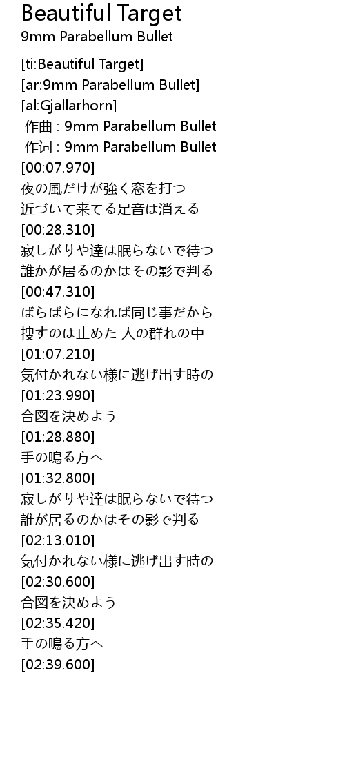 | [00:01.00] | 作词 : 9mm Parabellum Bullet |