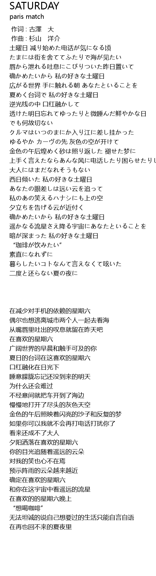 | [01:14.427] | 夏めく台词で 私の好きな土曜日 |