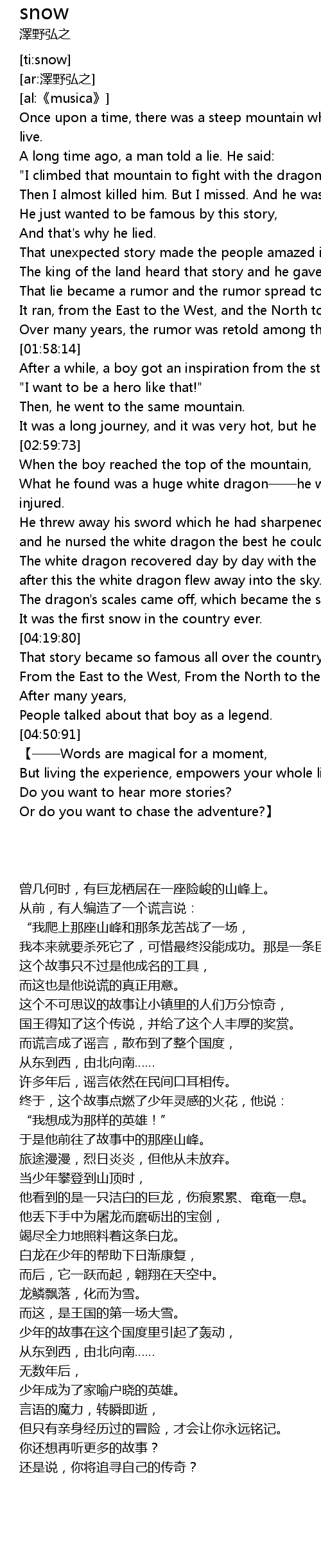 | [01:18.73] | 我本来就要杀死它了,可惜最终没能成功。那是一条巨大的漆黑的龙。” |