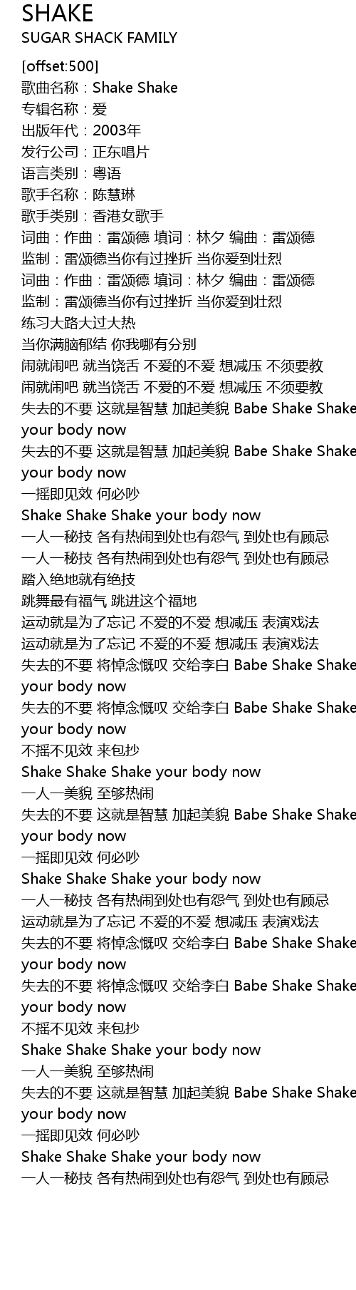 | [00:59.540] | 失去的不要 这就是智慧 加起美貌 Babe Shake Shake Shake your body now |