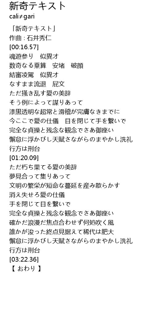 | [00:55.38] | 今ここで愛の仕儀 目を閉じて手を繋いで |