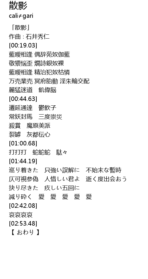 | [02:36.95] | 減り砕く 愛 愛 愛 愛 愛 |