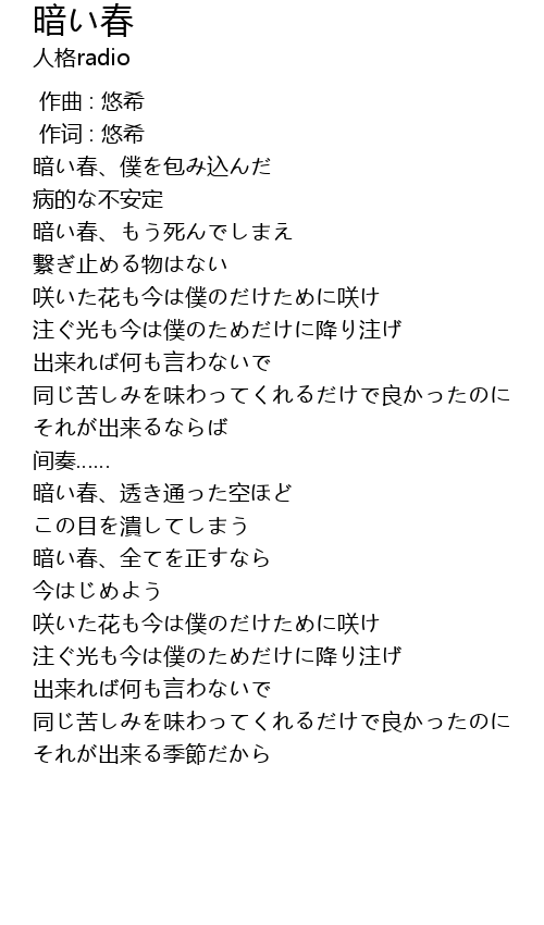 | [00:21.35] | 暗い春、もう死んでしまえ |