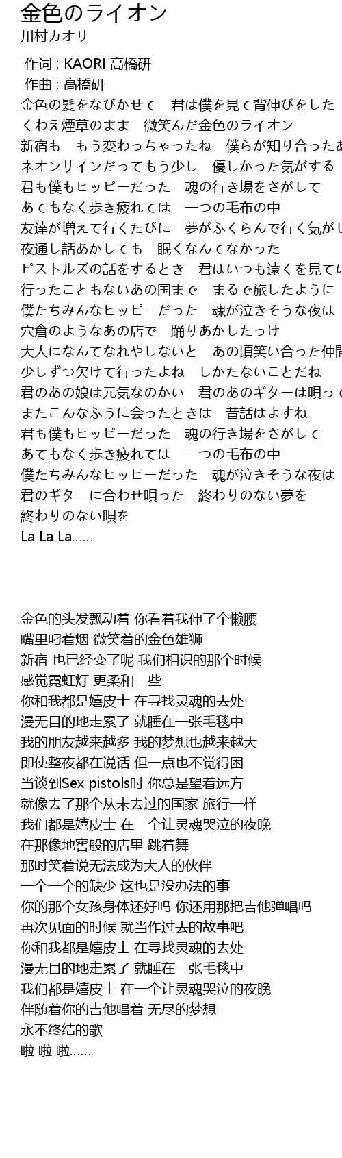 | [00:15.71] | くわえ煙草のまま 微笑んだ金色のライオン |