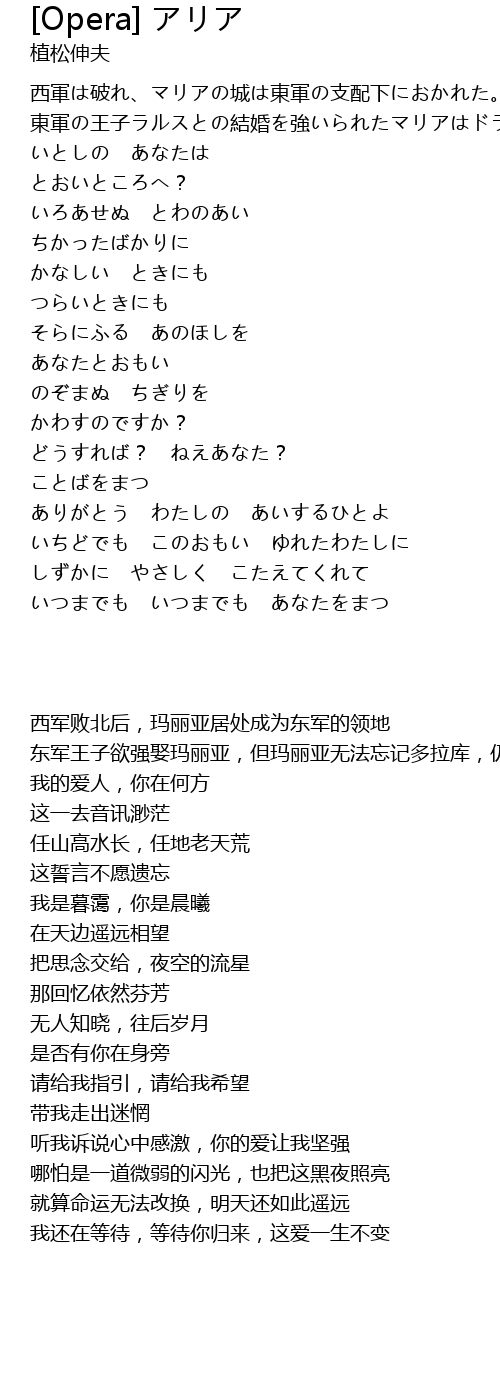 | [00:05.000] | 东军王子欲强娶玛丽亚,但玛丽亚无法忘记多拉库,仍每晚仰望夜空思念恋人 |