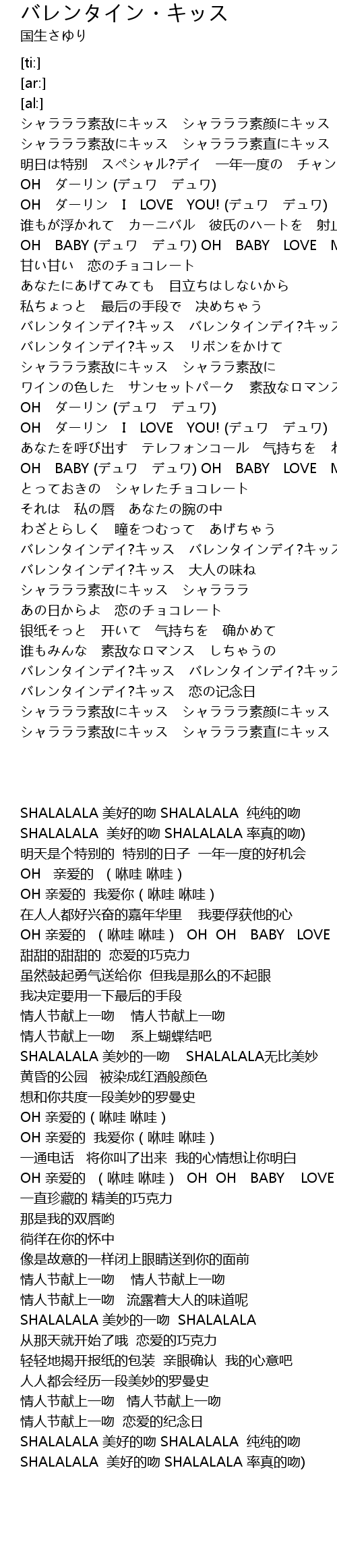 | [00:01.20] | SHALALALA 美好的吻 SHALALALA 纯纯的吻 |