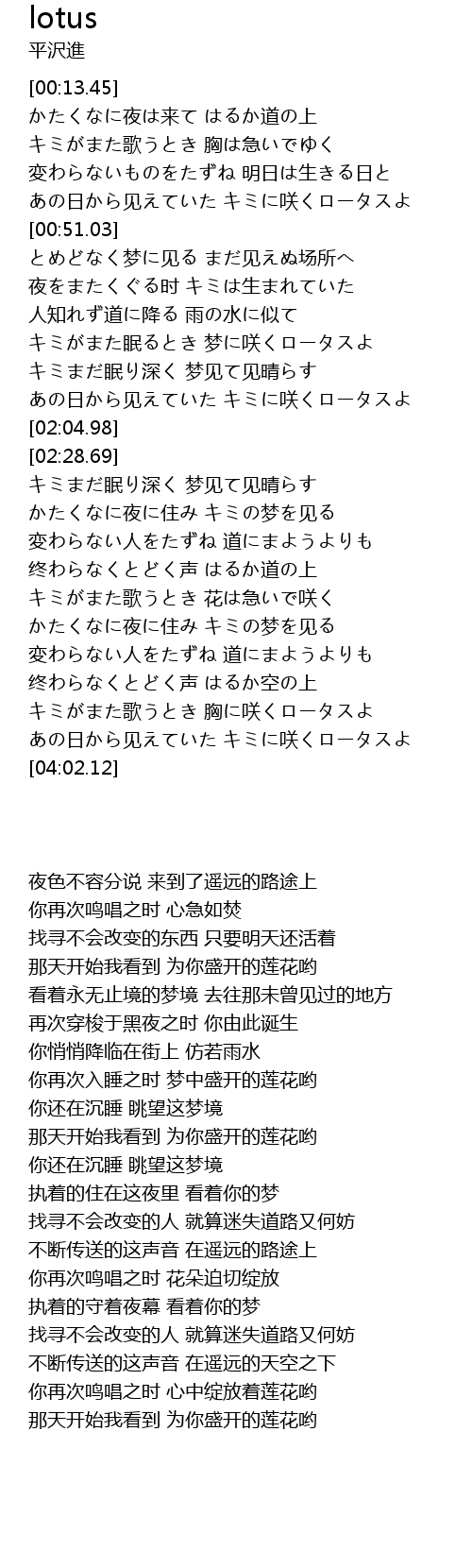 | [03:44.01] | キミがまた歌うとき 胸に咲くロータスよ |