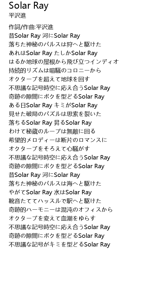 | [02:24.104] | やがてSolar Ray 水はSolar Ray |