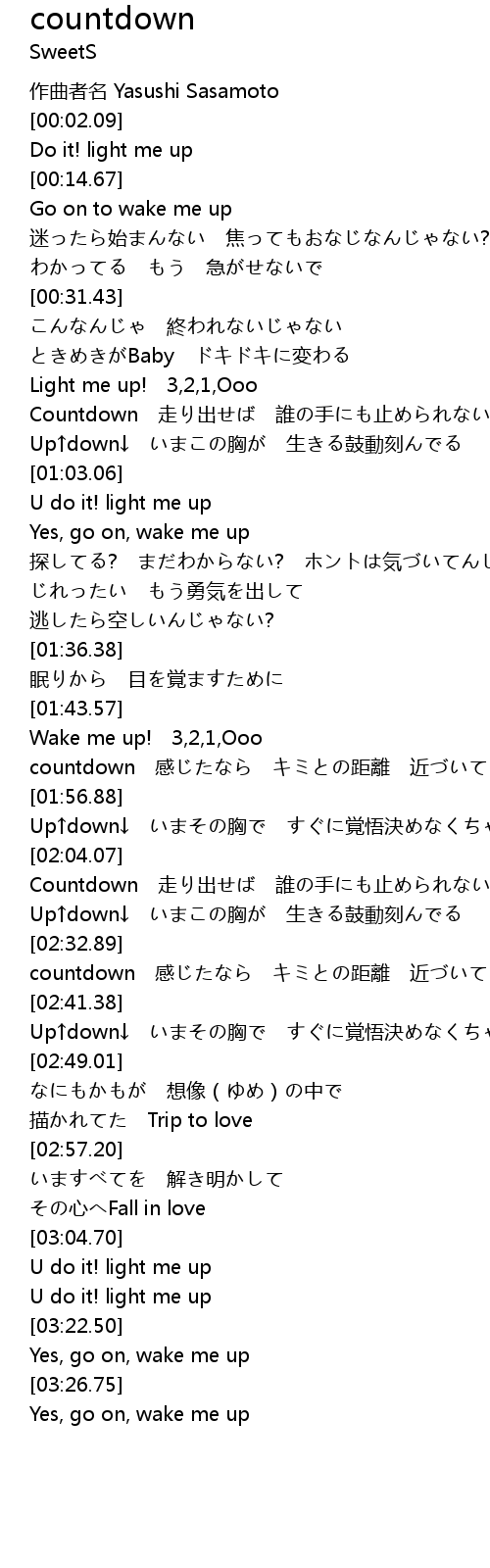 | [02:34.01] | countdown 感じたなら キミとの距離 近づいていく |