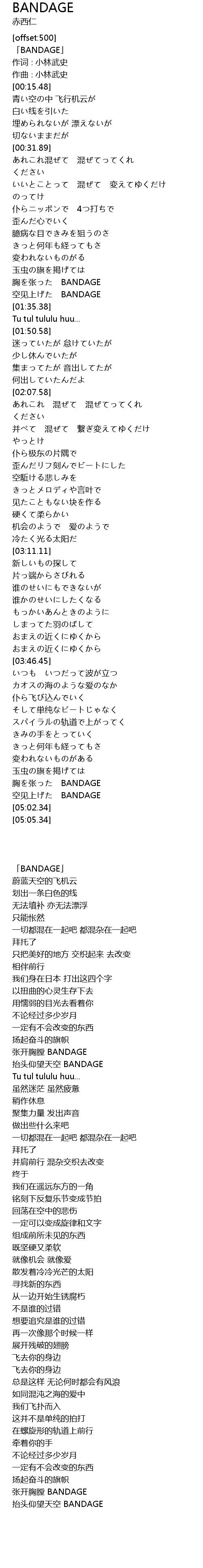 | [04:55.40] | 抬头仰望天空 BANDAGE |