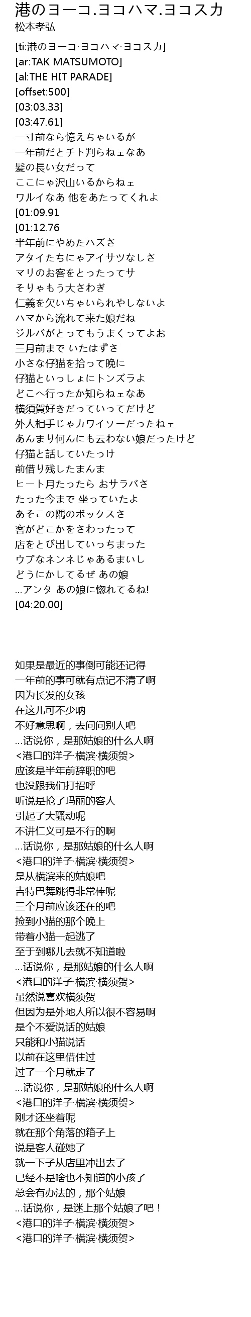 | [00:39.53][01:12.76][01:51.13][02:57.47][03:34.20][03:41.21] | <港のヨーコ·ヨコハマ·ヨコスカ> |