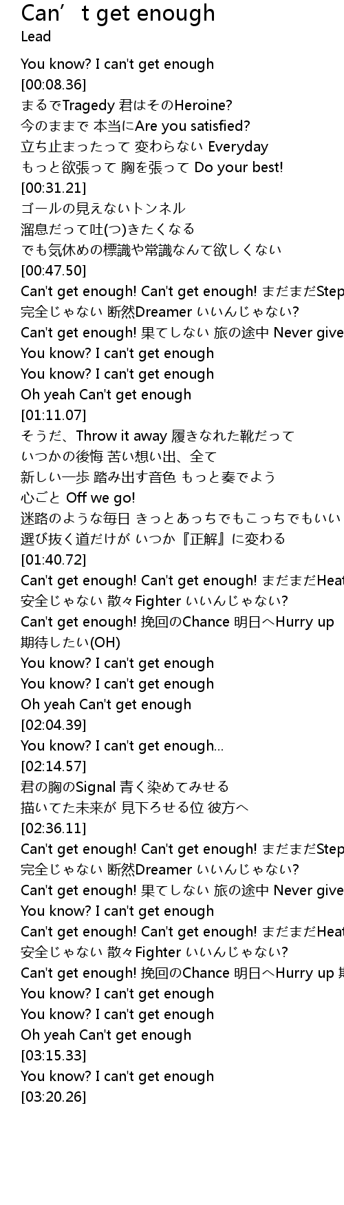 | [02:59.55] | Can't get enough! 挽回のChance 明日へHurry up 期待したい |