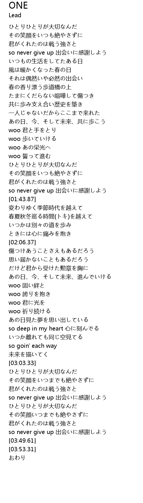 | [01:38.11] | so never give up 出会いに感謝しよう |