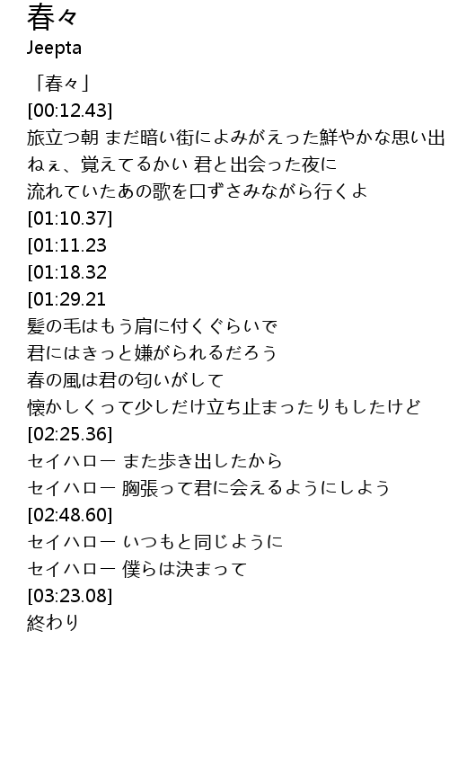 | [03:23.65][01:11.23] | セイハロー また君に会った時 |