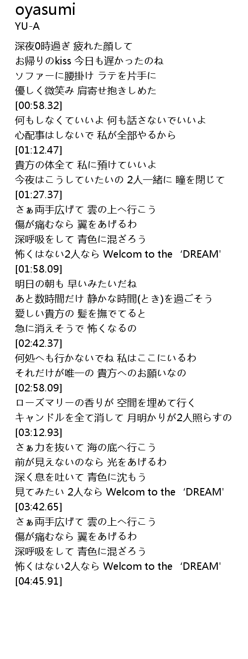 | [01:49.91] | 怖くはない2人なら Welcom to the‘DREAM' |