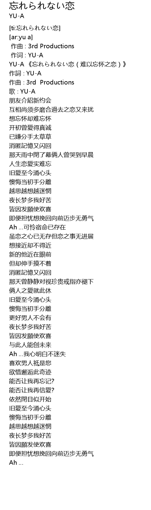 | [00:00.56] | YU-A 《忘れられない恋(难以忘怀之恋)》 |