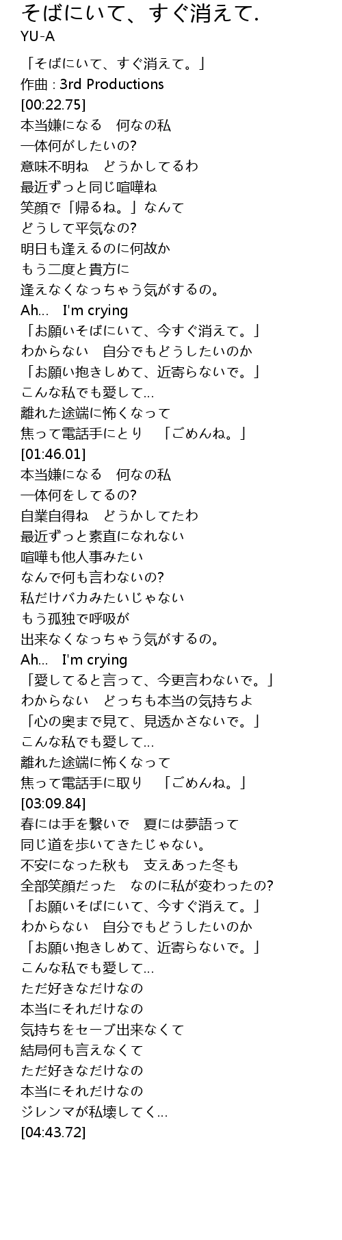 | [01:10.56] | 「お願いそばにいて、今すぐ消えて。」 |