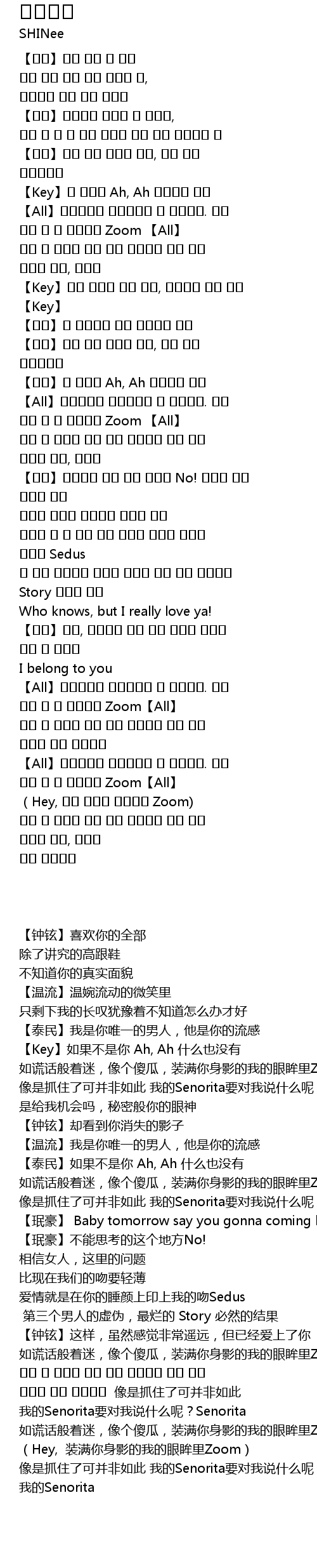 | [02:56.60] | 잡힐 듯 잡히지 않아 나의 세뇨리따 무슨 말을 하려는 거니 세뇨리따 像是抓住了可并非如此 我的Senorita要对我说什么呢?Senorita |