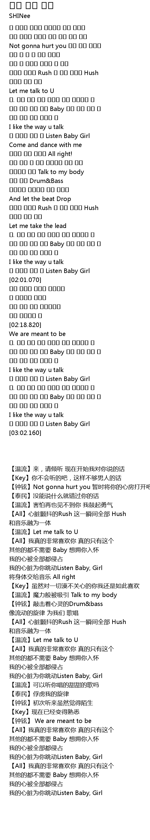 | [02:58.520] | 내 가슴이 뛰는 걸 Listen Baby Girl |