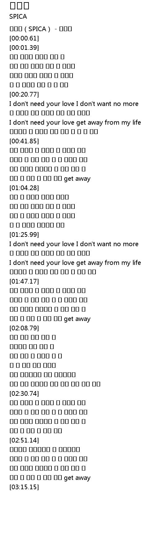 | [02:03.19] | 두고 봐 네가 더 아플 거야 get away |
