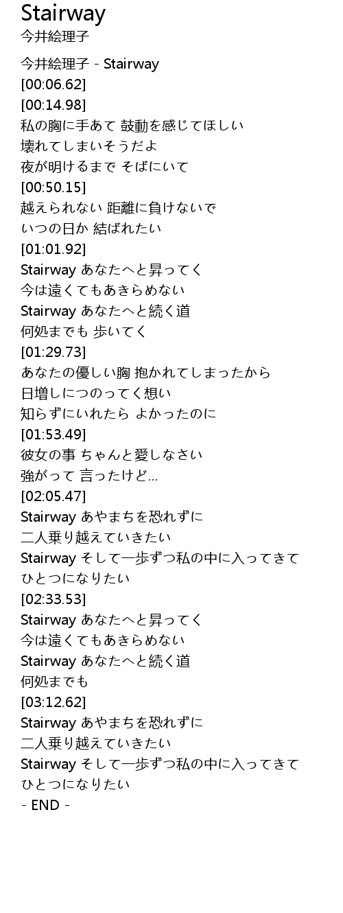 | [00:00.00] | 今井絵理子 - Stairway |