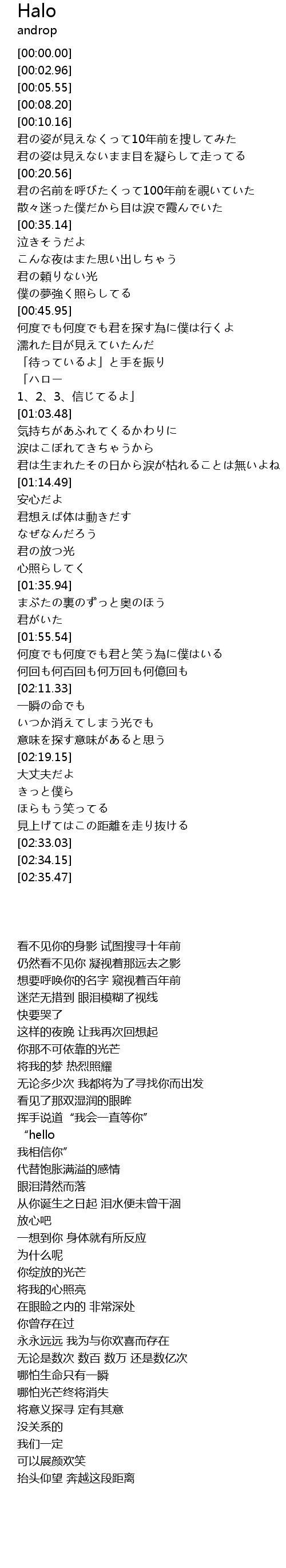 | [00:46.17] | 何度でも何度でも君を探す為に僕は行くよ |