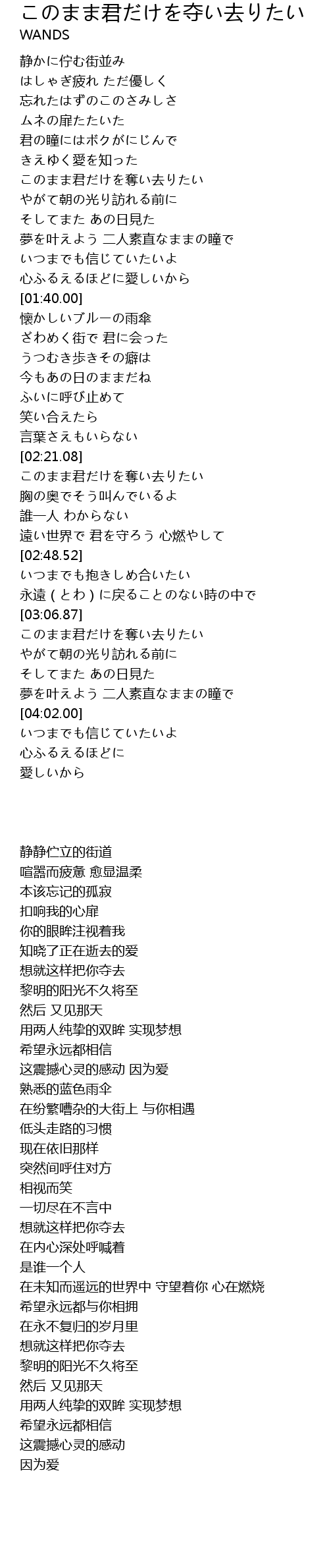 | [02:21.88] | このまま君だけを奪い去りたい |