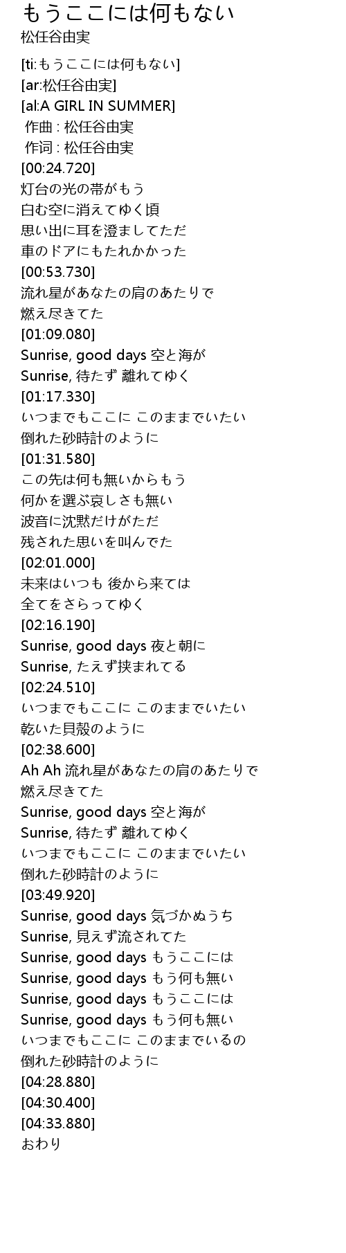 | [04:10.350] | Sunrise, good days もう何も無い |