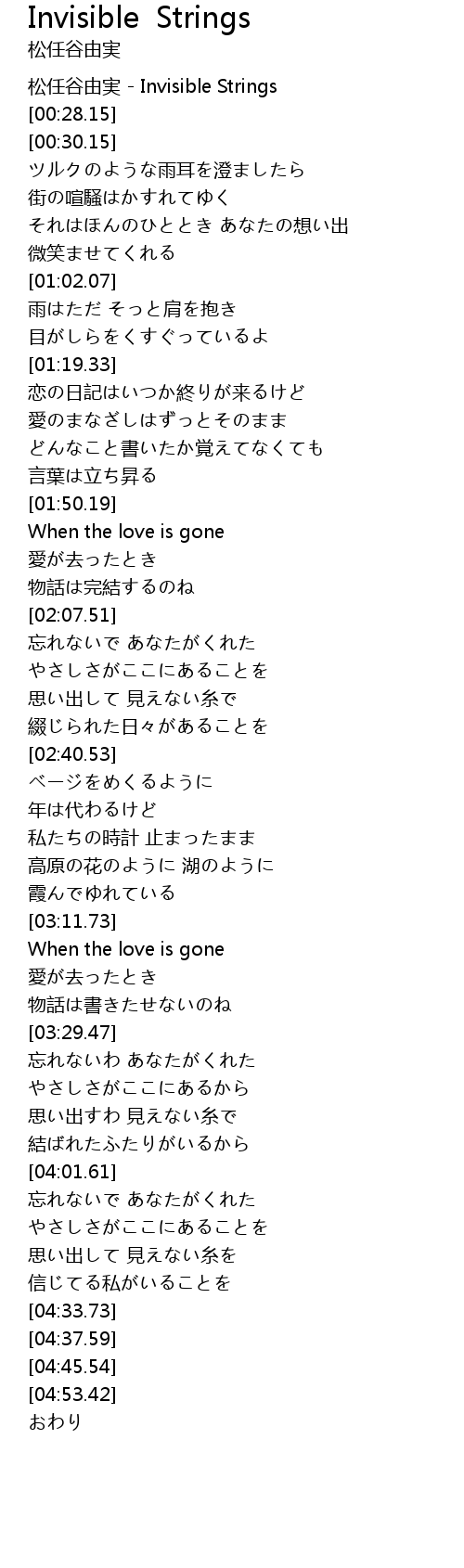 | [00:00.00] | 松任谷由実 - Invisible Strings |