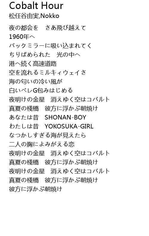 | [02:12.14] | 夜明けの金星 消えゆく空はコバルト |