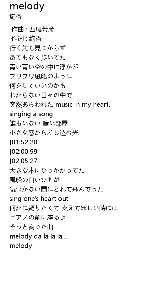 | [00:59.26][01:52.20][02:32.09][02:40.91][02:58.67] | melody melody |