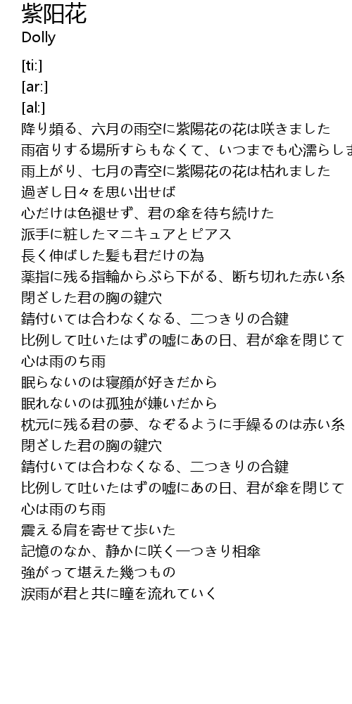 | [01:01.45] | 雨上がり、七月の青空に紫陽花の花は枯れました |