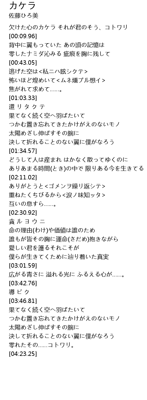 | [02:13.39] | ありがとうと<ゴメンヲ繰リ返シテ> |