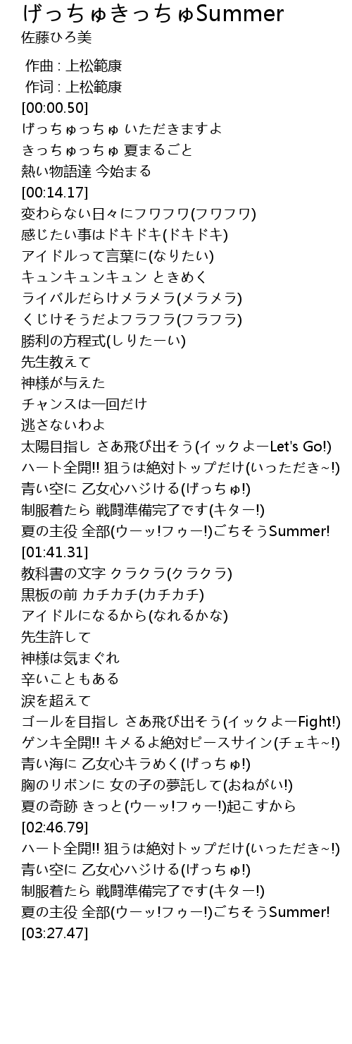 | [03:02.58] | 青い空に 乙女心ハジける(げっちゅ!) |
