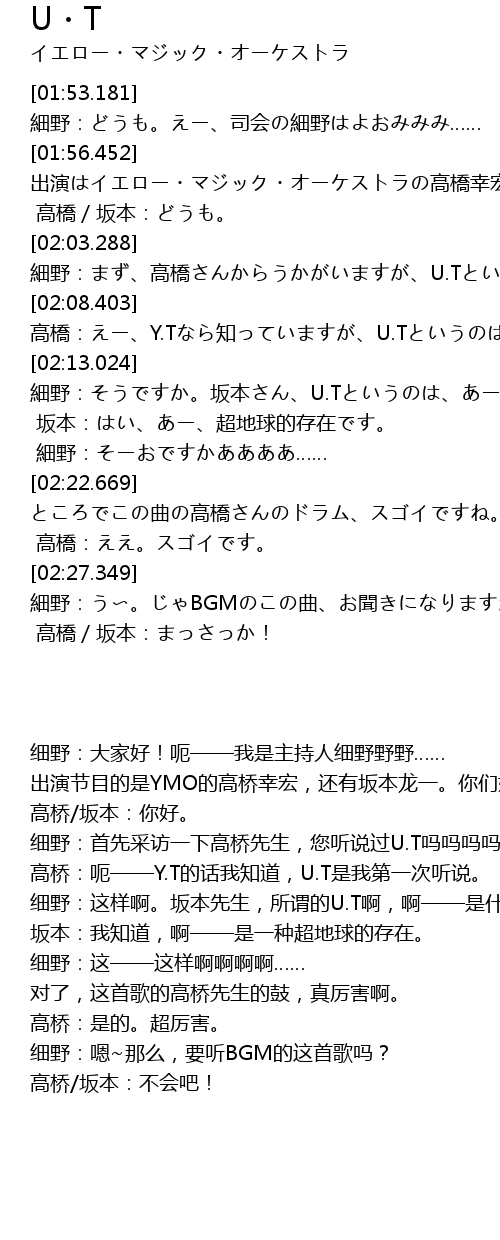 | [02:13.024] | 细野:这样啊。坂本先生,所谓的U.T啊,啊——是什么意思啊啊啊啊……? |