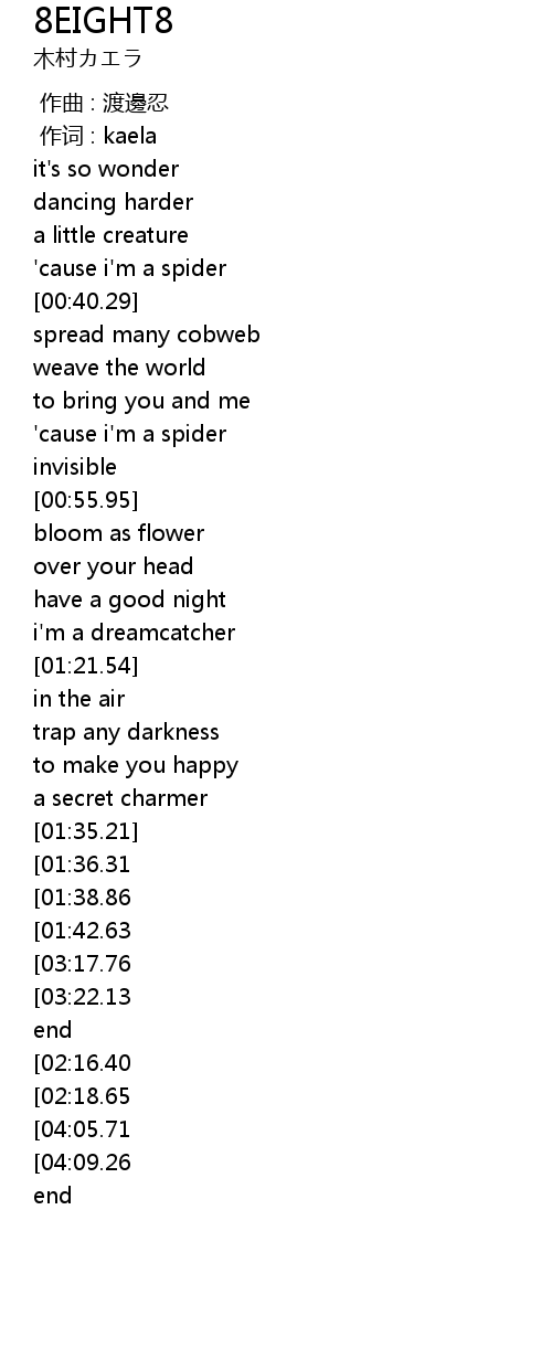 | [03:05.84][01:36.31] | 8 eyes 8 legs |