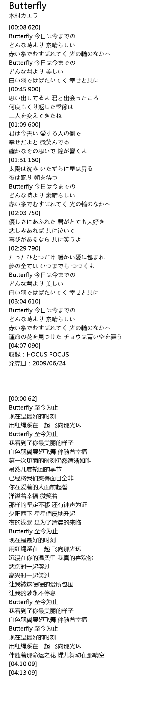 | [03:54.38] | 伴随着那命运之花 蝶儿舞动在那晴空 |