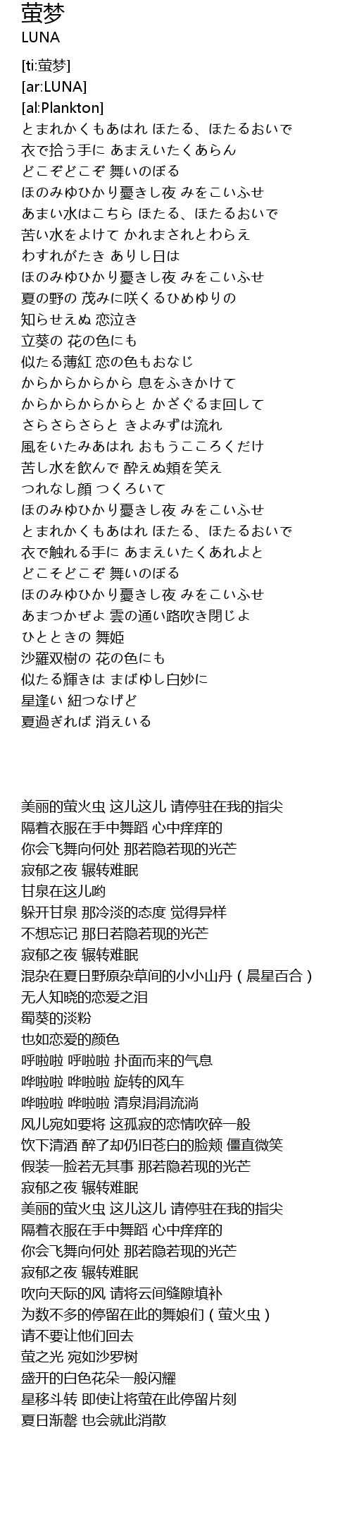 | [03:36.33] | 星移斗转 即使让将萤在此停留片刻 |