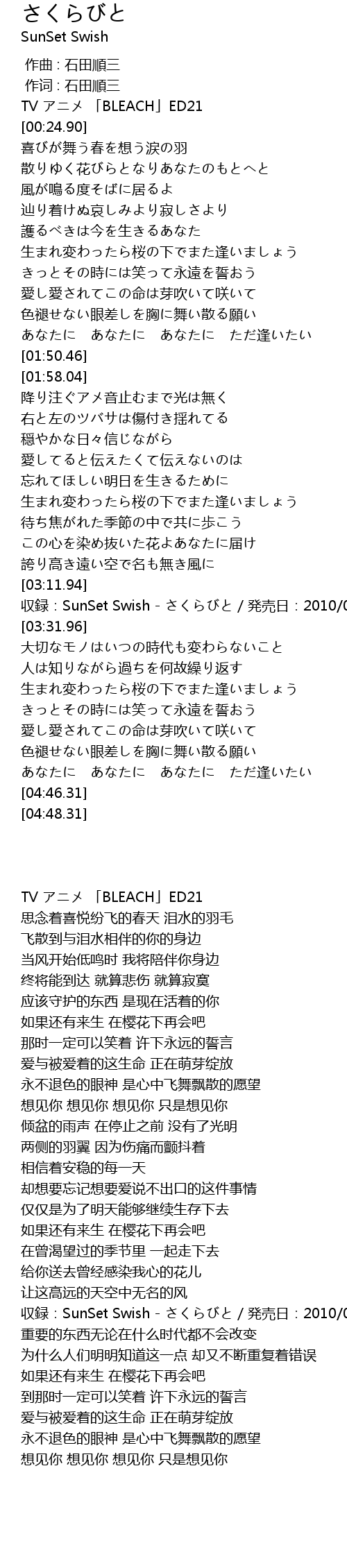 | [03:13.94] | 収録:SunSet Swish - さくらびと/発売日:2010/01/13 |